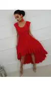 Wielbicielki stylu flamenco i hiszpańskich inspiracji w modzie przepadają za czerwonymi sukienkami z falbanami. Asymetryczna sukienka hiszpanka ze sklepu kartes-moda.pl spełnia wymagania kobiet, dla których ten krój jest idealnym wyborem na każdą okazję. W zależności od charakteru i upodobań kobiety, dodatki zdecydują o ostatecznej stylizacji i konwencji stroju. Suknia odsłania ramiona, a dekolt w kształcie litery V okrywa miękka, duża falbana. Talię podkreśla odcięta część spódniczkowa sukienki, a marszczenia materiału pozwalają ukryć pewne niedoskonałości figury. Rozkloszowany dół jest zakończony regularną, pięknie wymodelowaną falbaną. Asymetryczna suknia z przodu ma długość przed kolana, a wydłużony tył sięga kostek.