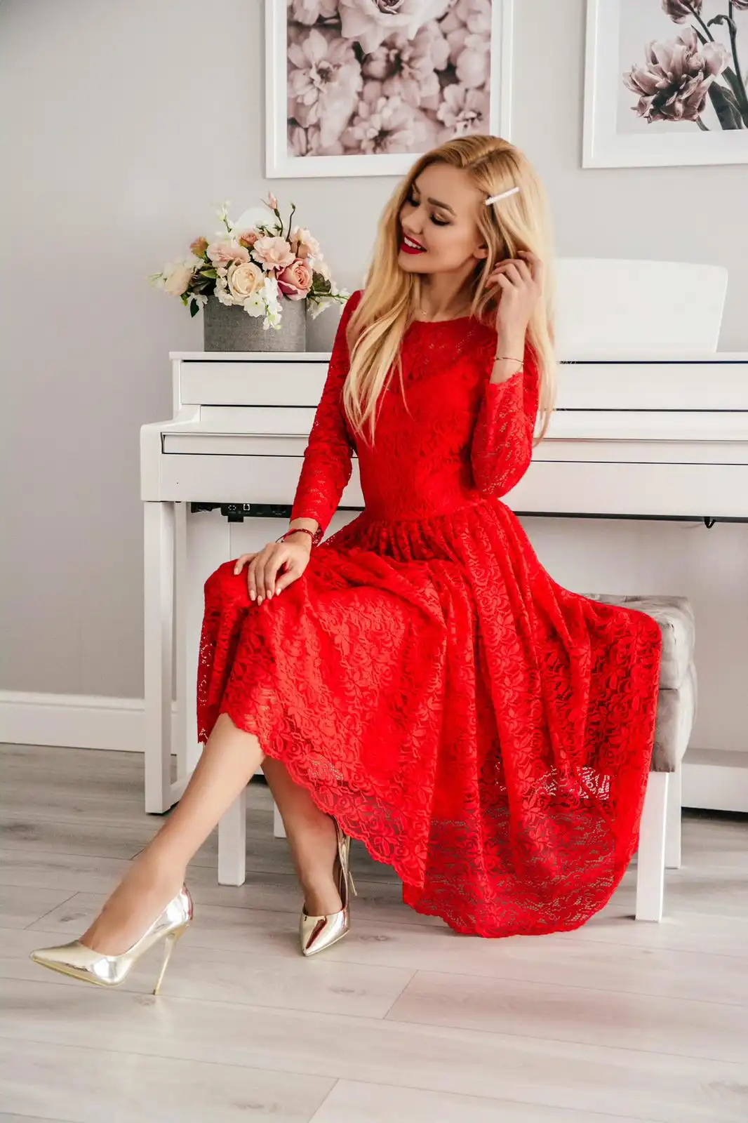 Carla - koronkowa sukienka midi ma klasyczny dekolt pod szyję. Rękaw ¾ sprawia, że z powodzeniem można ją nosić również w nieco chłodniejsze dni. Kreacja jest odcinana w pasie, dzięki czemu pięknie podkreśla wcięcie w talii. Ma ona rozkloszowany dół wykończony fabrycznym brzegiem, który skutecznie maskuje ewentualne mankamenty figury i pięknie wiruje w tańcu. Kreacja jest zapinana na kryty suwak.
