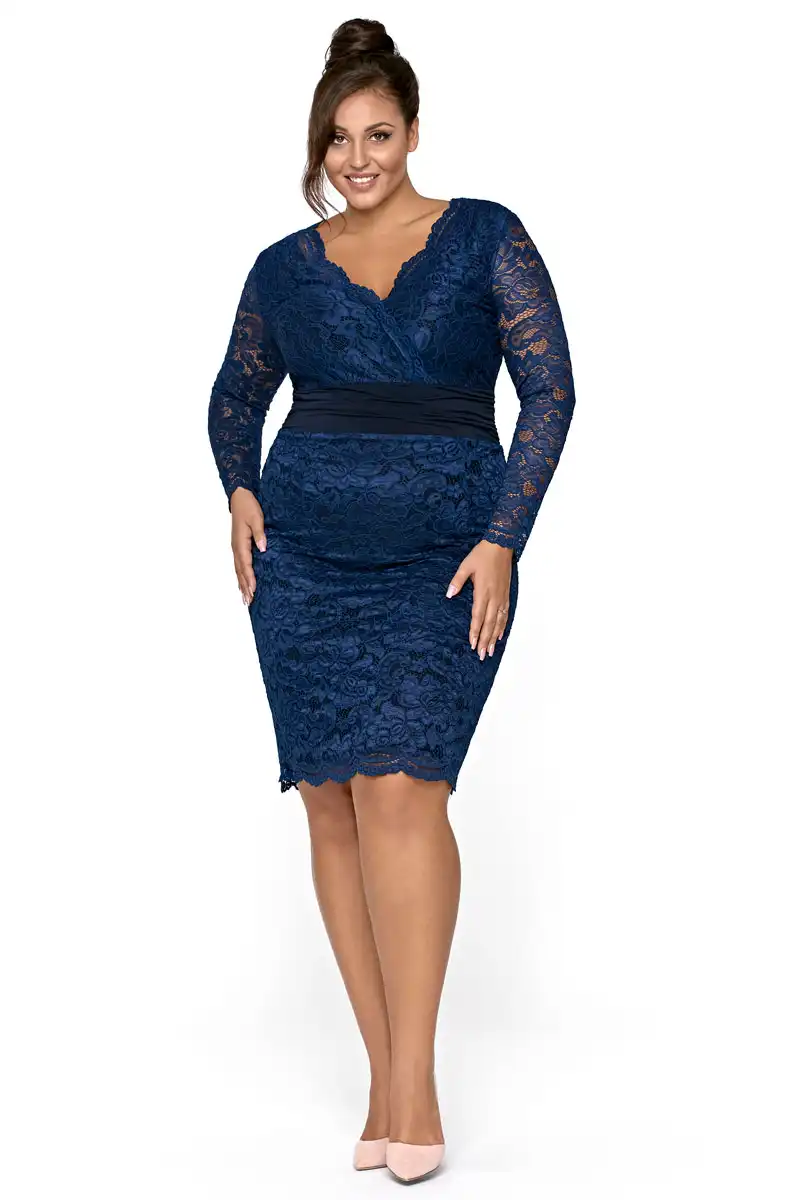 Granatowa wieczorowa sukienka z koronki to model, który sprawdzi się na wiele różnych okazji. Można ją założyć można na randkę, wesele czy bal karnawałowy. Ma ona piękny granatowy kolor, w którym korzystnie będzie się prezentować każda kobieta, bez względu na typ urody. Kreacja została wykonana z wysokiej jakości materiału z niewielką domieszką elastanu, co sprawia, że ładnie układa się na sylwetce, podkreślając jej atuty. Z tych samych materiałów uszyto podszewkę, dzięki której sukienka zachowuje swoją naturalną formę. Kreacja została zaprojektowana i uszyta w całości w Polsce. Dostępna jest w rozmiarach od 46 do 52, dzięki czemu każda pani nosząca rozmiar plus size znajdzie tu coś dla siebie.